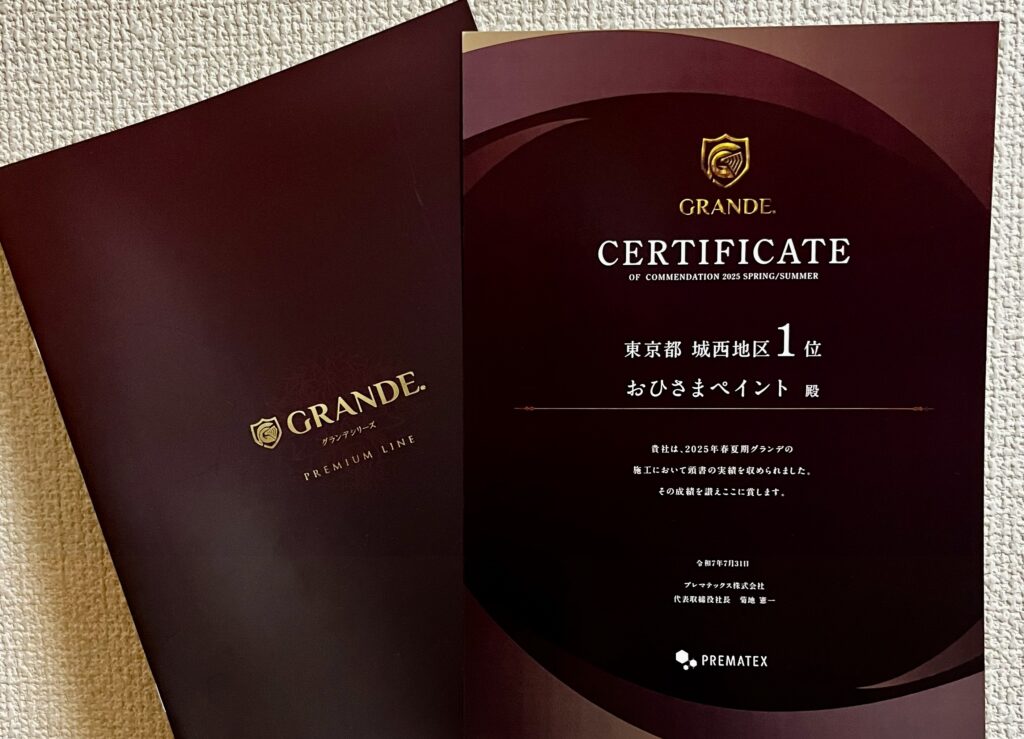このたび、おひさまペイントはプレマテックス株式会社の塗料「GRANDE」2025年春夏期の施工において東京都 城西地区1位の実績を上げ、賞状を頂きました!